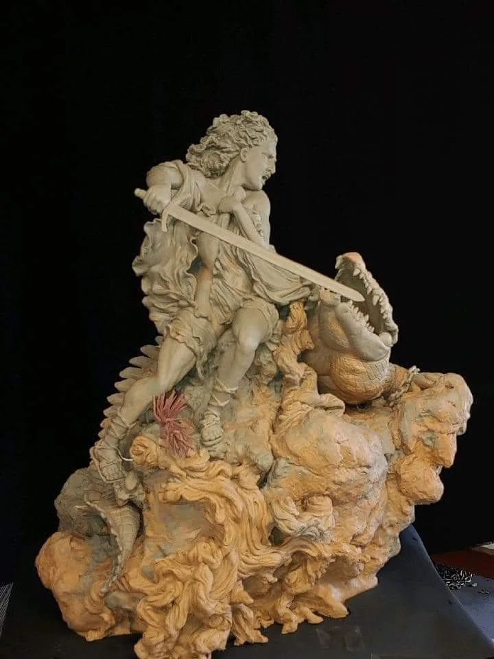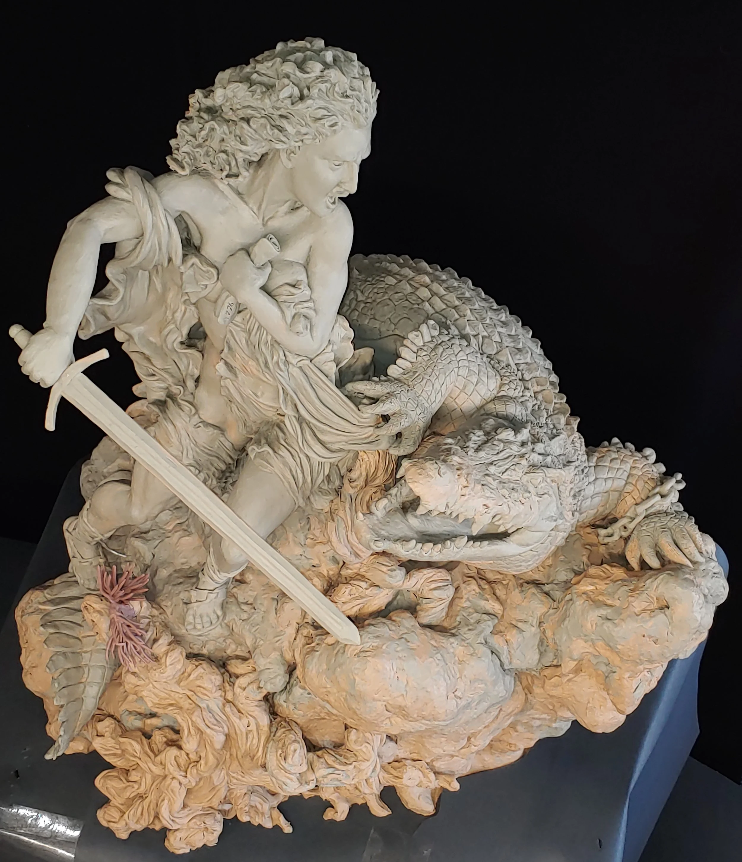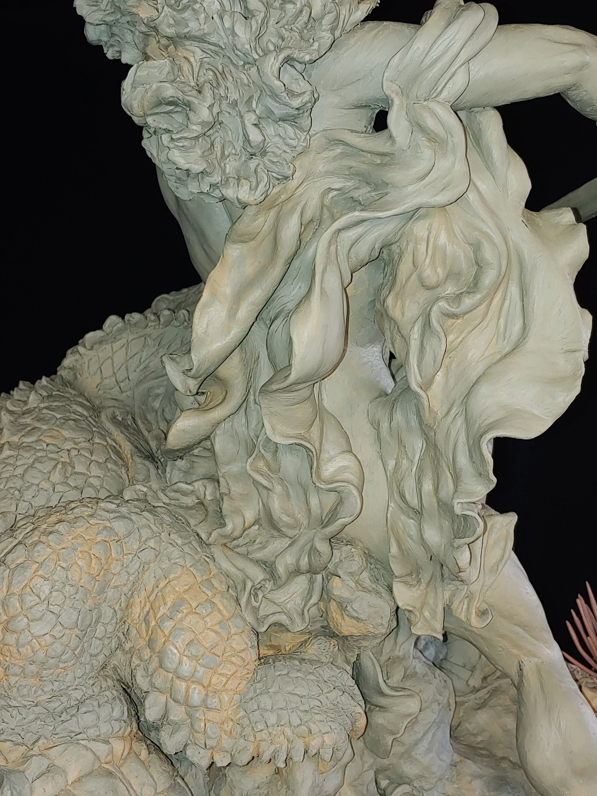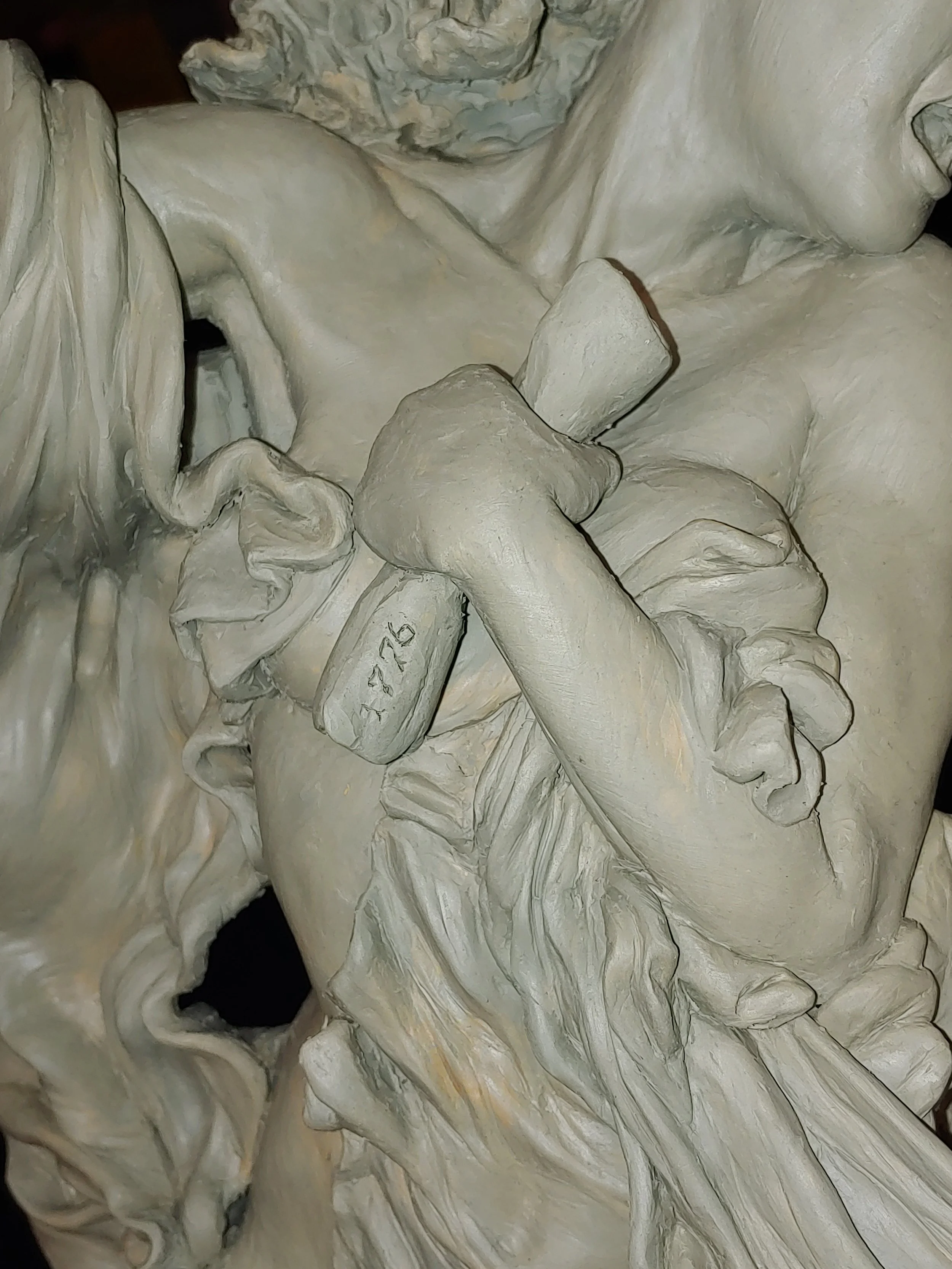 This is the clay stage. Later to be cast in white patinaed bronze. The final composition will actually be taller, and missing details added.